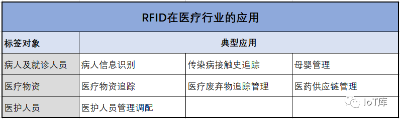RFID在醫(yī)療行業(yè)的應用非常豐富,針對不同的對象和場景,有如下表所示應用: